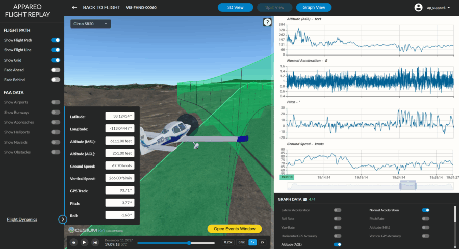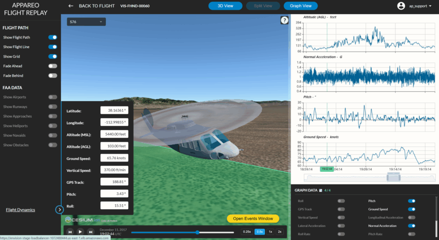 Review your full flight path in a dynamic 3D window, jump directly to key flight events and exceedances, and explore flight data using custom graphing tools and adjustable playback controls. If you’ve used AS Flight software in the past, you’ll recognize many familiar elements, now streamlined inside EnVision.